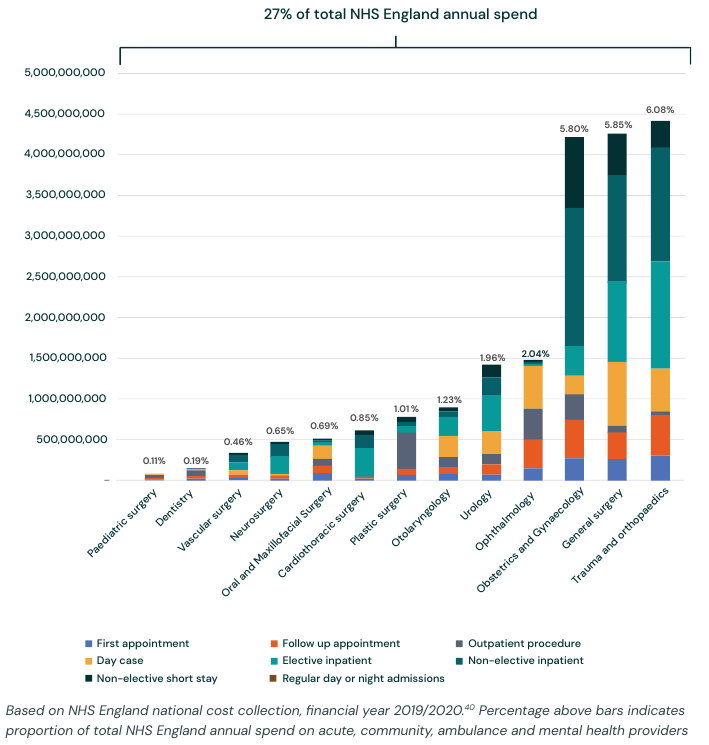 Figure 3. Annual spend on surgical care in the National Health System (NHS) of England, 2019/20. From Figure 2 in UK Health Alliance on Climate Change (2023).