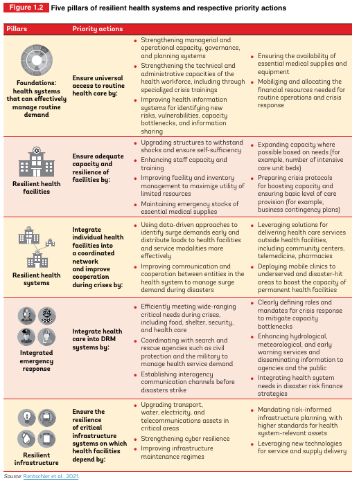 Figure 7. Five pillars of resilient health systems and respective priority actions resulting from the Japanese experience. From "Preparing health systems for shocks - Japan's experience of enhancing the resilience of its health system"