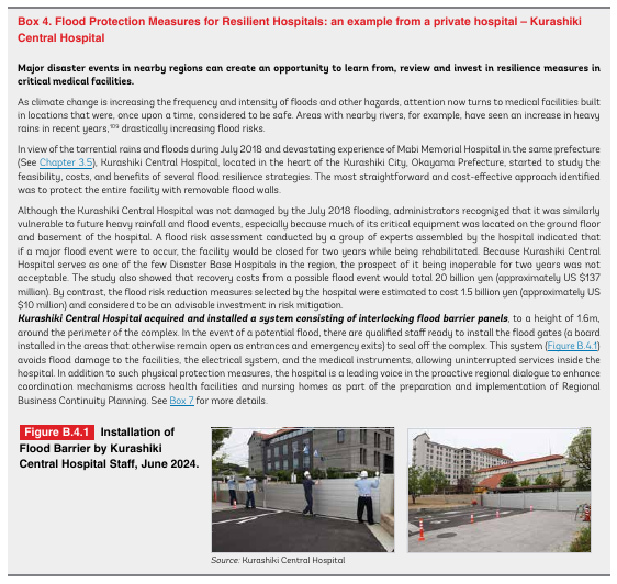 There are several success stories at the international that may inspire a global strategy. For instance, in Japan the above mentioned report Preparing health systems for shocks - Japan's experience of enhancing the resilience of its health system presents the interesting case study described in Figure 8 where a hospital was flood proofed.